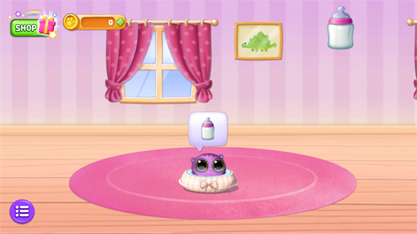 3、根据小萌宠头顶的气泡提示,拖动奶瓶等道具完成日常喂养任务;